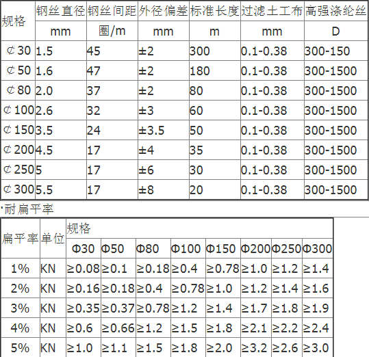 透水管是以防銹彈簧圈支撐管體,形成高抗壓軟式結構,無紡布內(nèi)襯過濾,使泥砂雜質(zhì)不能進入管內(nèi),從而達到凈滲水的功能。滌綸絲外繞祉覆層具有優(yōu)良吸水性,能迅速收集土體中多余水份。橡膠筋使管壁被覆層與彈簧鋼圈管體成為有機一體,具有很好的全方位透水功能,滲透水順利滲入管內(nèi),而泥砂雜質(zhì)被阻擋在管外,從而達到透水、過濾、排水之目的。