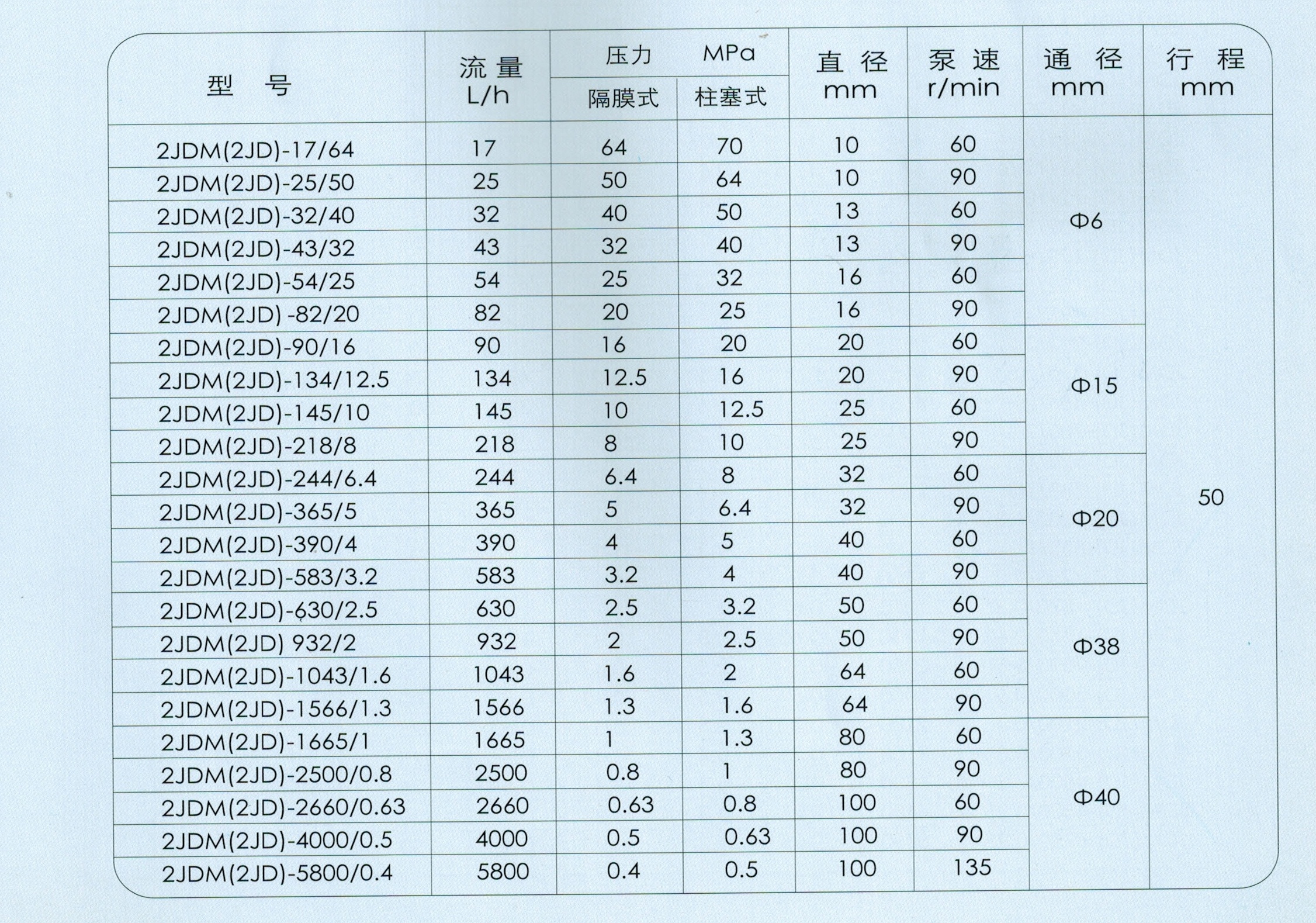 2JD柱塞計量泵1. 該系列泵為雙缸泵,工作壓力平穩(wěn),也可單缸使用,以便不停產(chǎn)檢修。2. 獨特的內(nèi)置補油系統(tǒng),內(nèi)置壓力釋放系統(tǒng)。3. 無論泵工作與否,均可調(diào)節(jié)流量。4. 配用電機:功率: 2.2KW Y 系列普通式或 YB 系列防暴電機 型號: Y112M1 -6B5 YB112M1-6B5 N=960r/min 或 Y100L1 -4B5 YB100L1 -4B5 n=1440r/min5. 整機重量